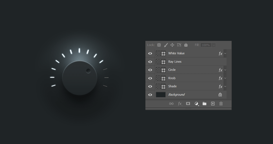 All the visual effects (shadows, gradients, glows, ridges..) are made using the built-in Layer Styles functionality: this allows for scaling without losing quality and precise editable tuning and changes