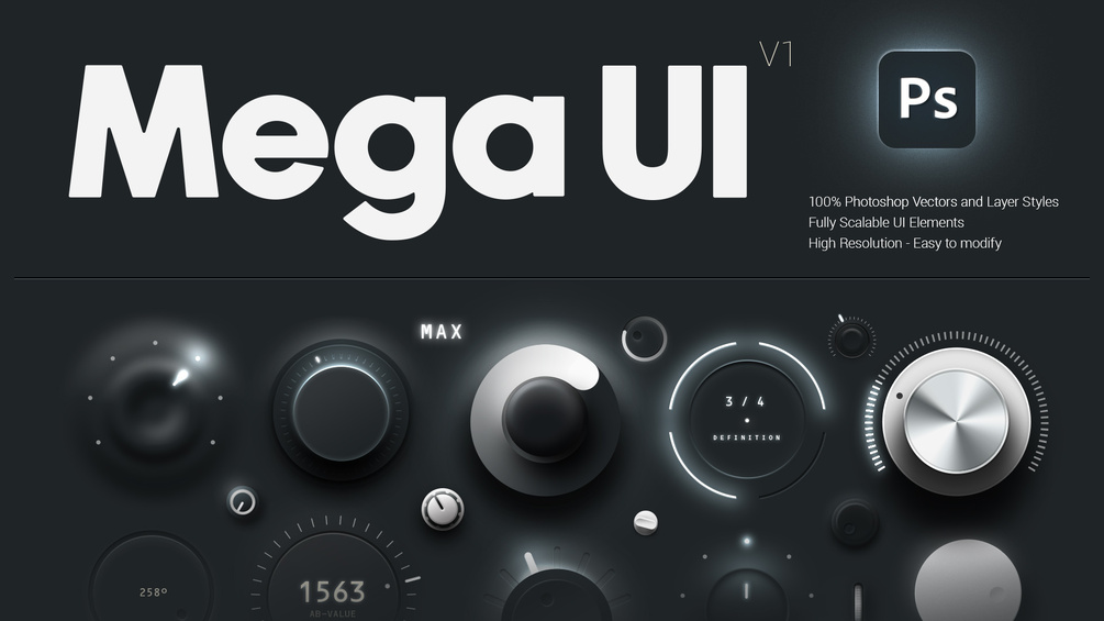 Introducing Mega UI v1, a comprehensive high-quality UI kit for Photoshop, designed for creators building futuristic and functional interfaces. This set includes Photoshop .psd files: